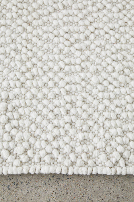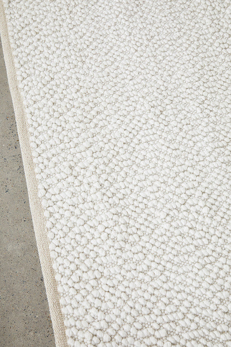 Indulge in the soothing comfort of the Boucle White rug, a contemporary gem that effortlessly adds warmth and cosiness to any space. Its off-white hue, infused with subtle natural undertones, makes it an excellent choice for neutral homes, exuding elegance and versatility. The rug's beautifully textured surface creates a luxurious Textile feel, inviting you to experience its softness underfoot. Enhancing its visual appeal, the rug is elegantly framed with flat weave borders on the ends, providing a grounding effect and a touch of refinement. Transform your room into a serene sanctuary with the modern charm and inviting allure of the Textile White rug.