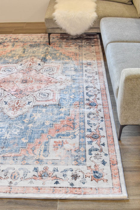 Introducing the Atlas Chiraz Rose Rug - expertly crafted with a blend of soft blue and pink hues, featuring a distinctive medallion design. Not only does it add style to any room, but it also offers practicality with its machine washable and non-slip features. Perfect for high-traffic areas with a touch of elegance.